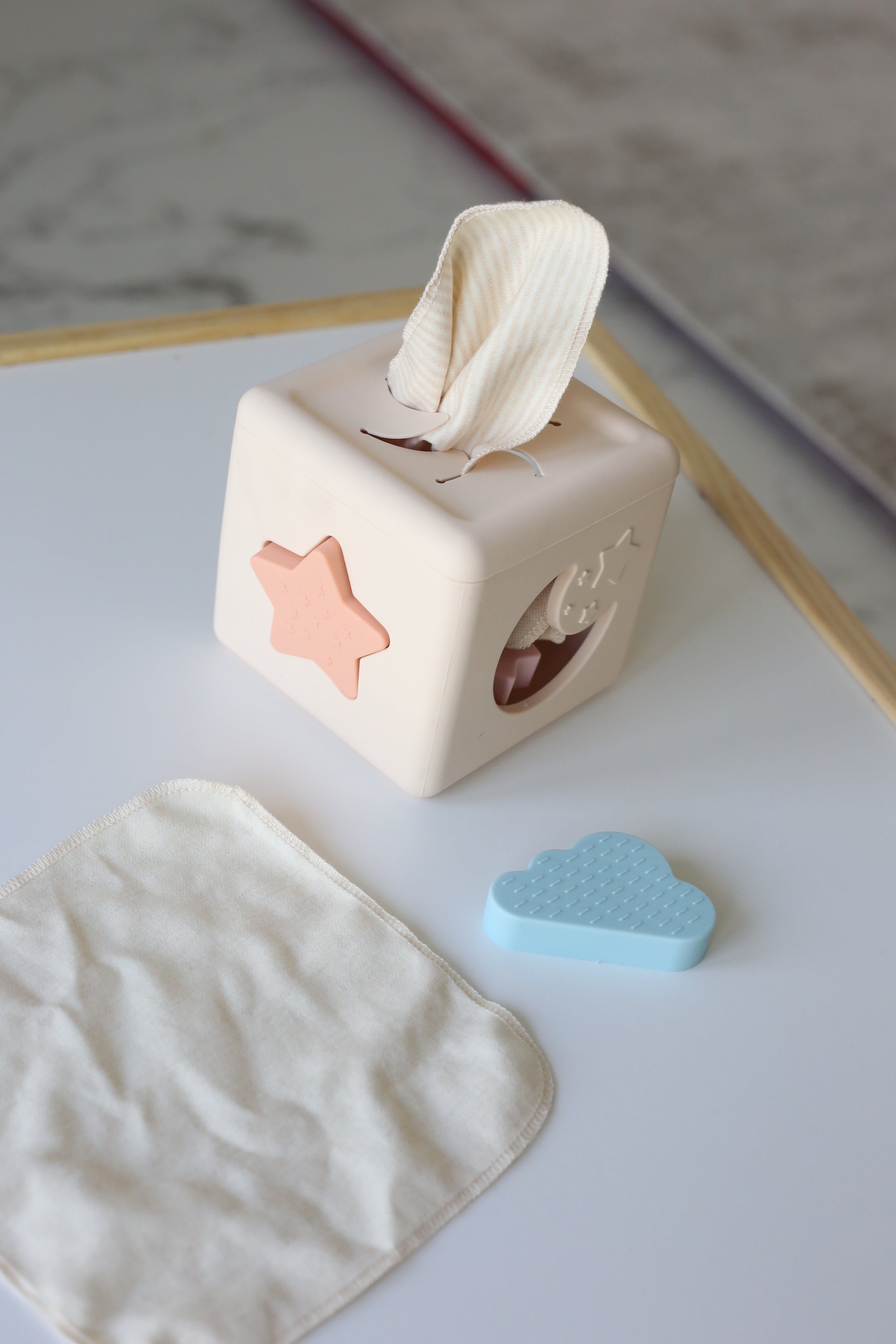 Say hello to the Peekaboo Puzzle Cube... the ultimate sensory surprise for curious little minds. With soft shape-sorting slots on every side and a colourful cloth to pull, twist and tuck away again, this cube keeps tiny hands busy and brains buzzing. Made from squishy, baby-safe silicone and designed for endless discovery, it’s as fun to explore as it is to chew on.