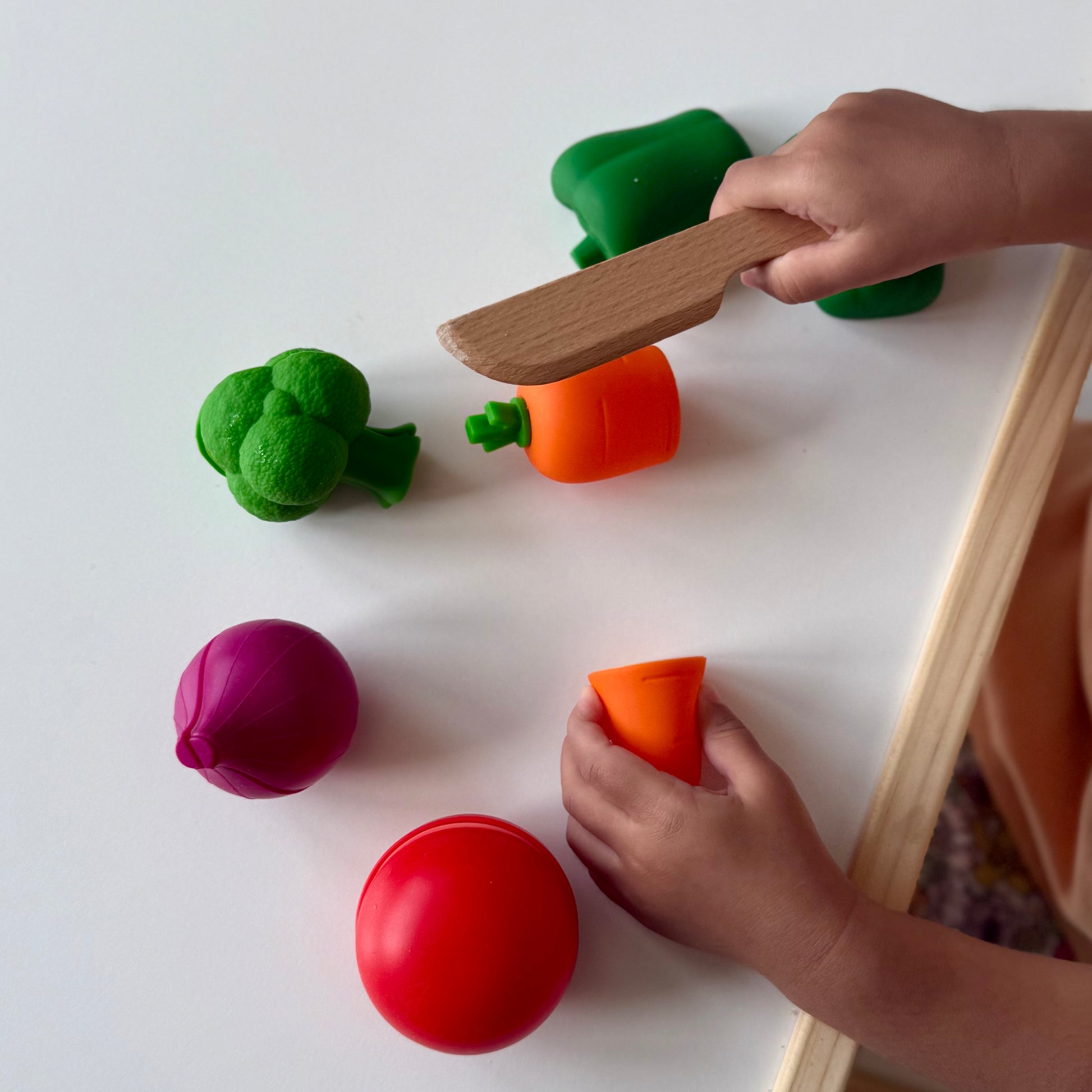 Bring the kitchen fun to playtime with our Slice & Snap Veggies, a modern, mess-free cutting set made from soft silicone with hidden magnets for a smooth, satisfying snap as little ones slice. Each veggie separates cleanly and clicks back together, helping to develop fine motor skills, hand strength, and imaginative chef play. Made from baby-safe silicone, it’s durable, hygienic and built to last through countless chopping sessions.